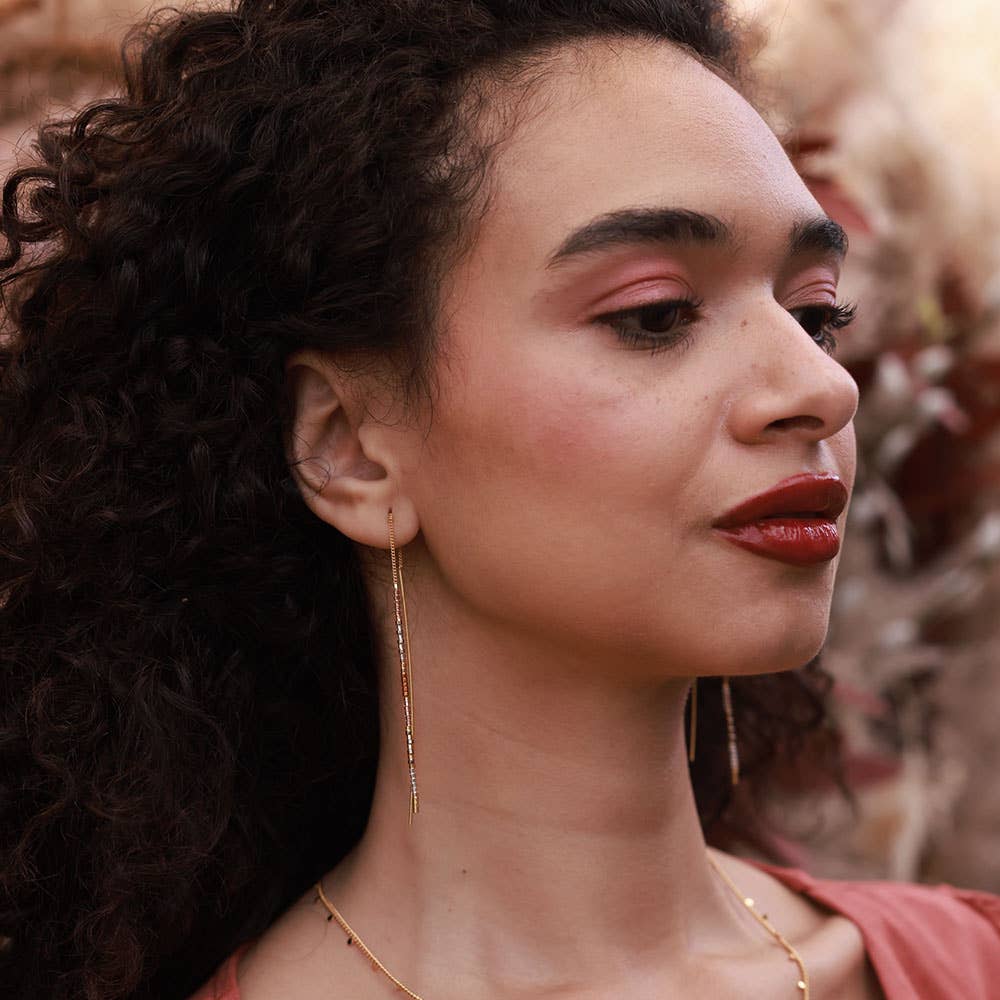 We are very excited about these new earrings! They combine our best selling threaders with our best selling Miyuki seed bead earrings. They hang 3.25" so they are swishy and sexy. Great for summer, and elegant enough for a dressy night out. Made with genuine Japaese Miyuki beads and 14k gold plated brass. Designed in our Sonoma California studio and made exclusively for us in Seoul South Korea.