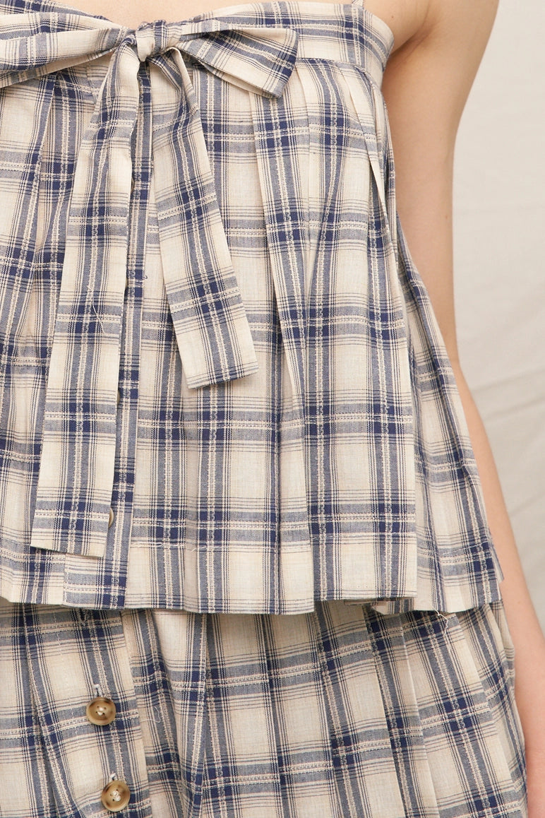 Embrace sunny days with the Cloudlight Tie Top, featuring playful spaghetti straps and a charming cream-and-blue plaid pattern. Its pleated ribbon detail adds a flirty touch, perfectly paired with our Cloud Drift shorts for a breezy, carefree look. Ideal for those who love to mix comfort with a splash of fun!
