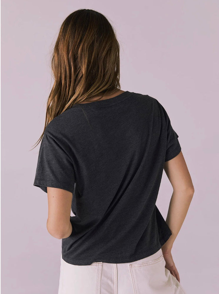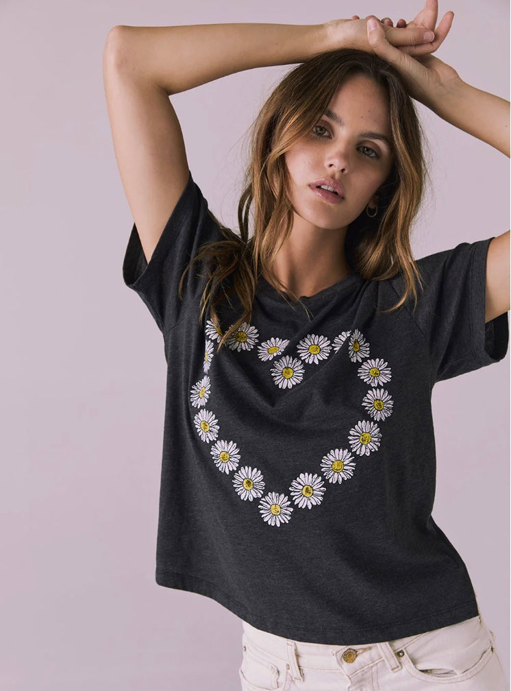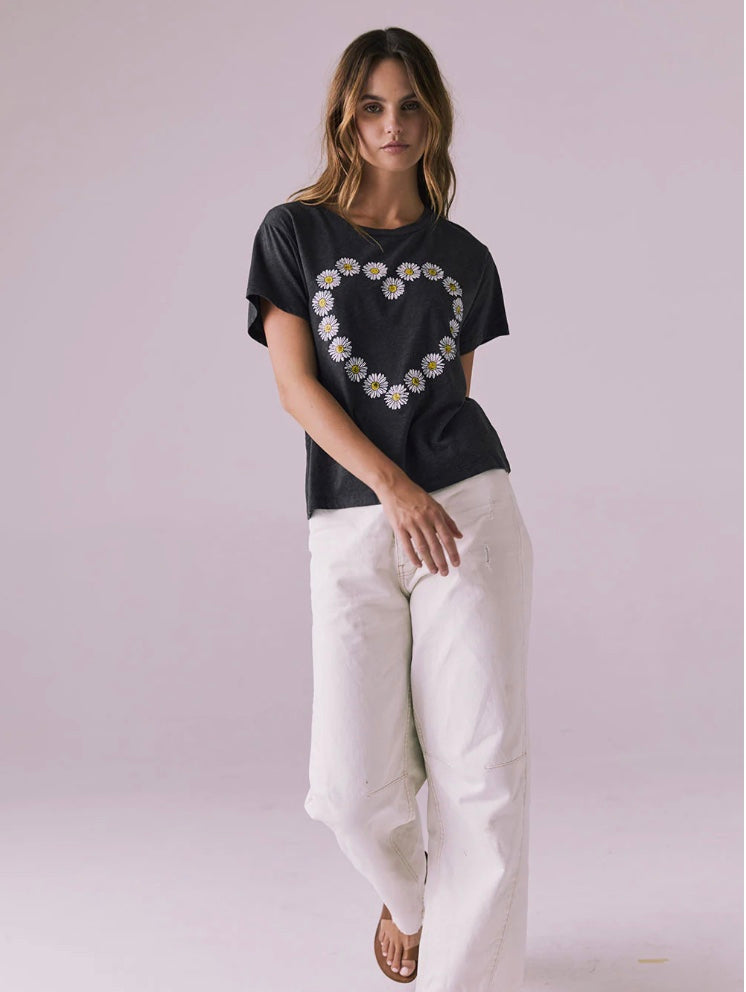Bring a touch of 90s charm to your wardrobe with the Daisy Heart Tee. This perfectly cropped vintage black tee features a playful flower design that adds a sweet, romantic vibe to any casual outfit. Made from a soft recycled vintage jersey blend of 60% cotton and 40% polyester, it offers comfort and style with an eco-friendly twist. The ribbed neckband completes the look, making it a fun and easy way to brighten your everyday style.