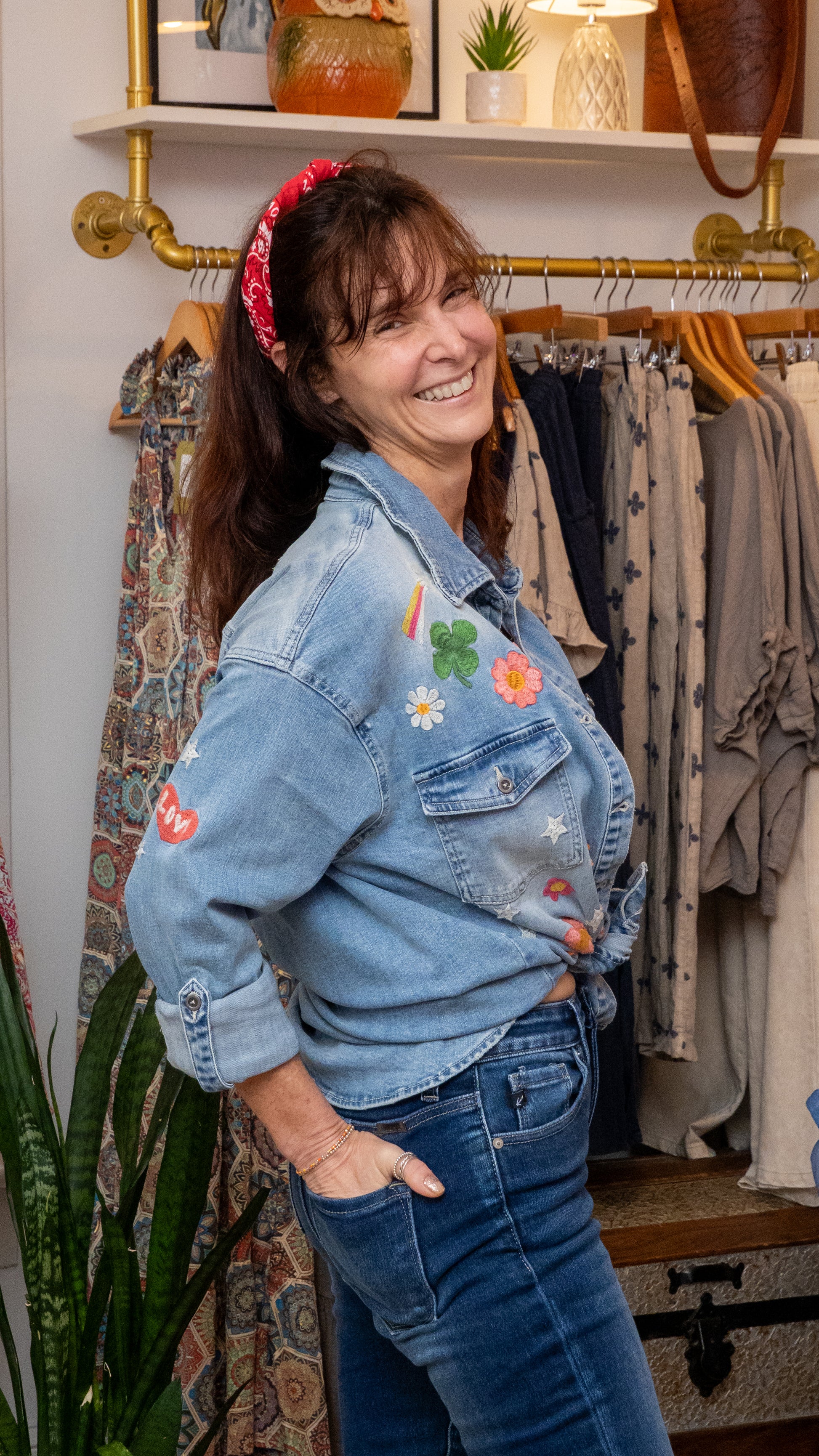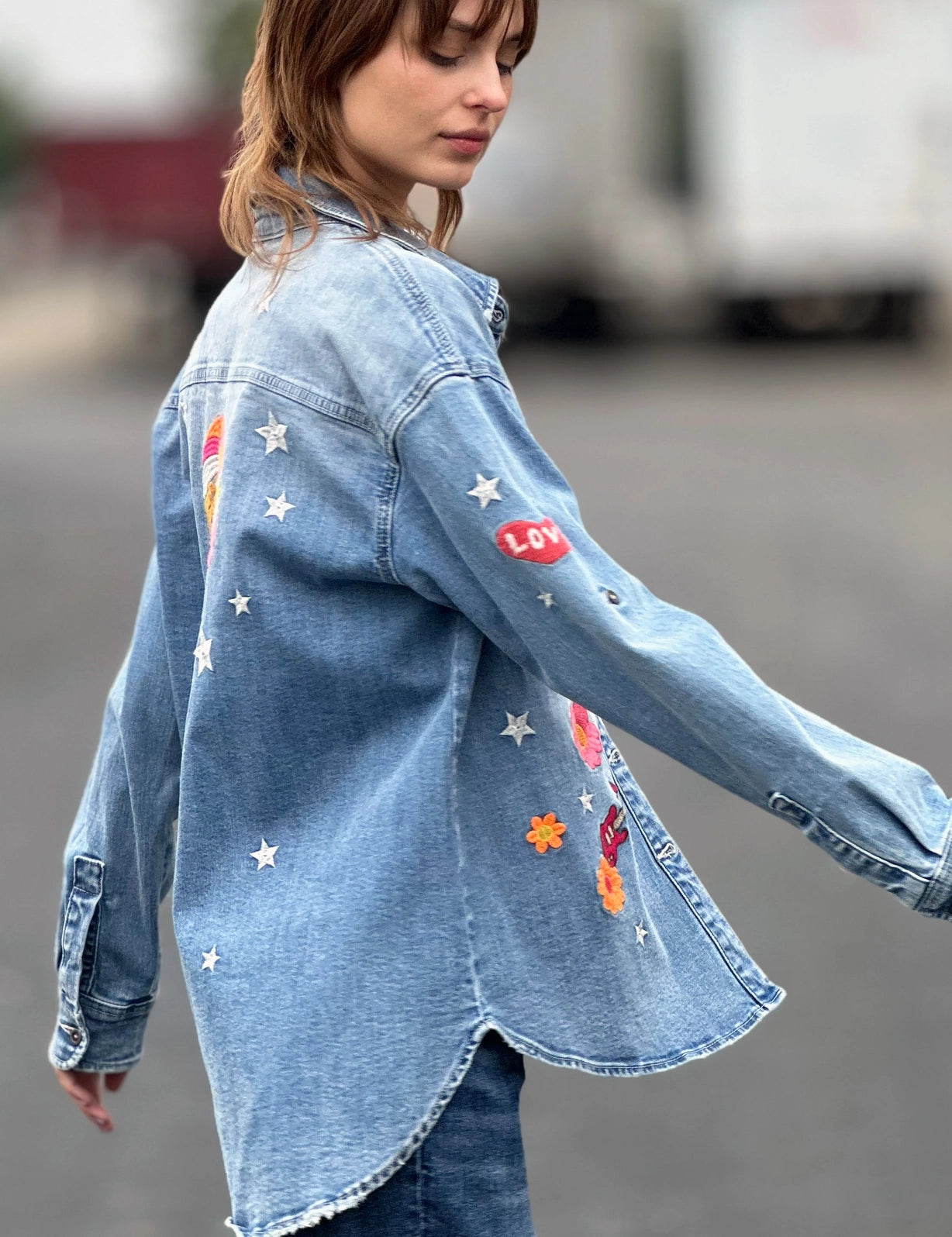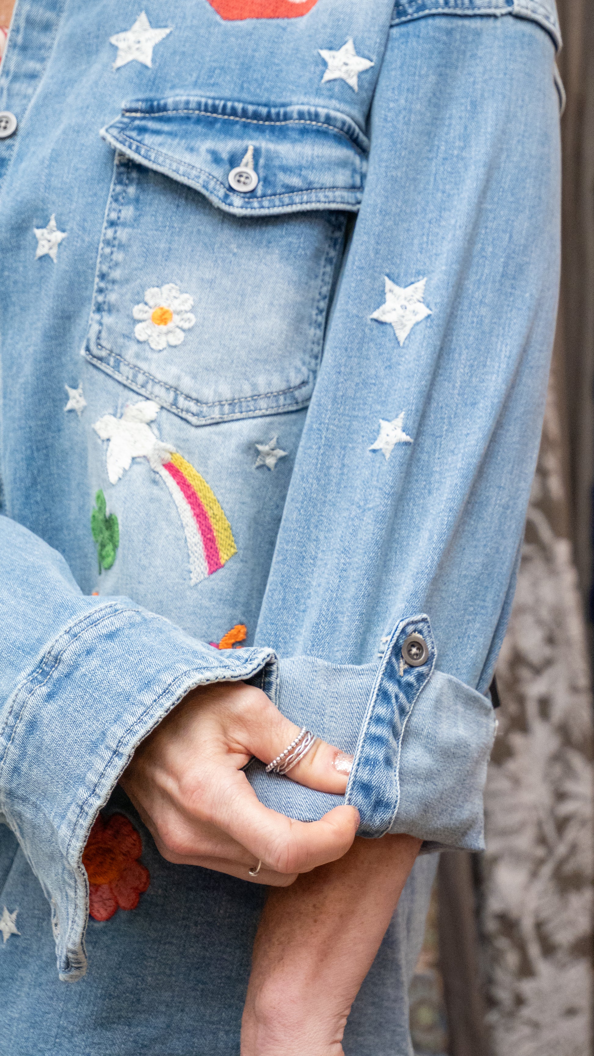 There are three indisputable essentials in life—Peace, Love and Music! We thought we'd share the vibe—in beautiful, colorful, '70's inspired embroidery—on this gorgeous denim shacket, to make you, and everyone who sees you, smile. Mission accomplished!
