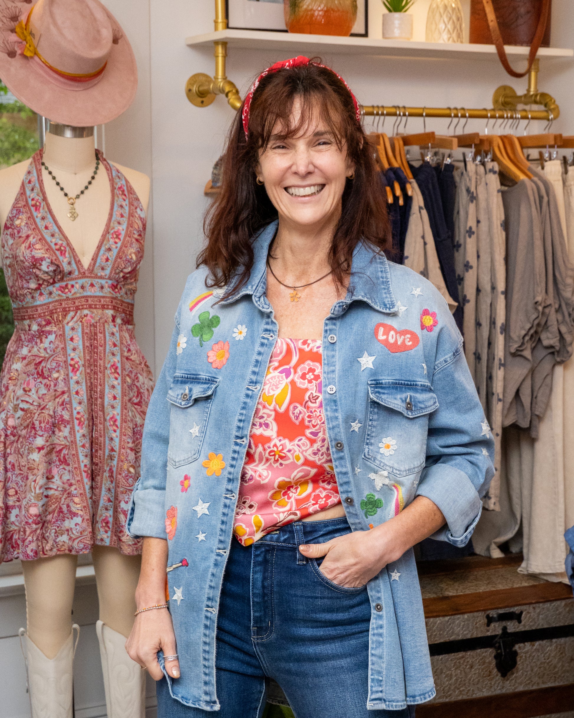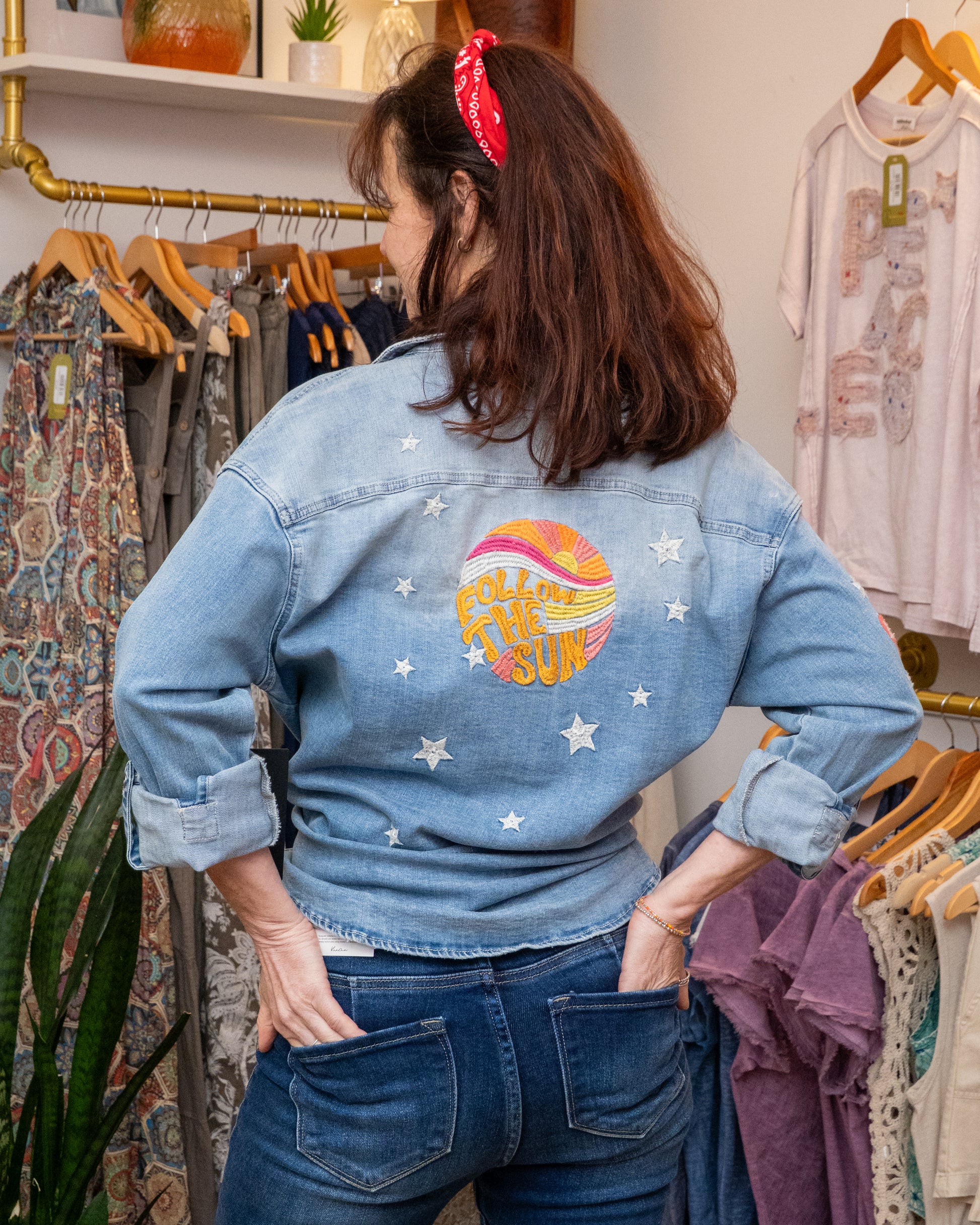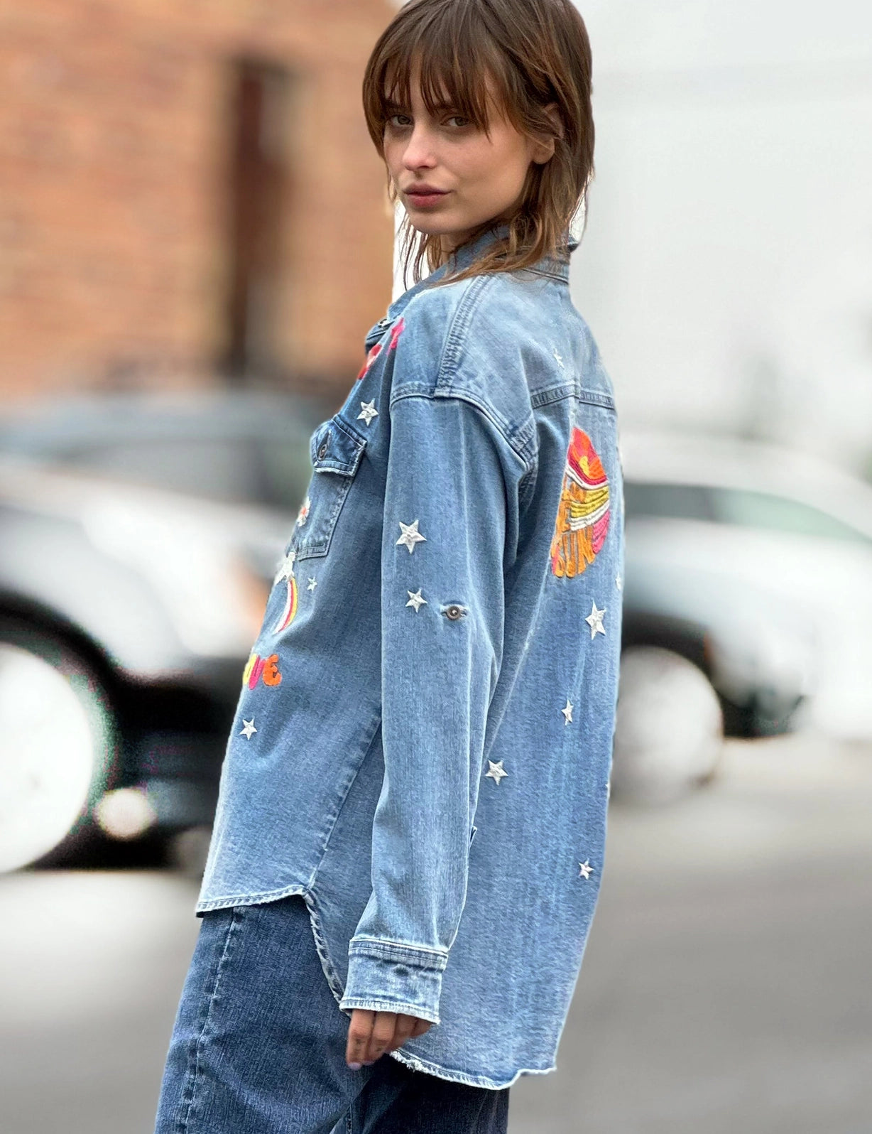 There are three indisputable essentials in life—Peace, Love and Music! We thought we'd share the vibe—in beautiful, colorful, '70's inspired embroidery—on this gorgeous denim shacket, to make you, and everyone who sees you, smile. Mission accomplished!