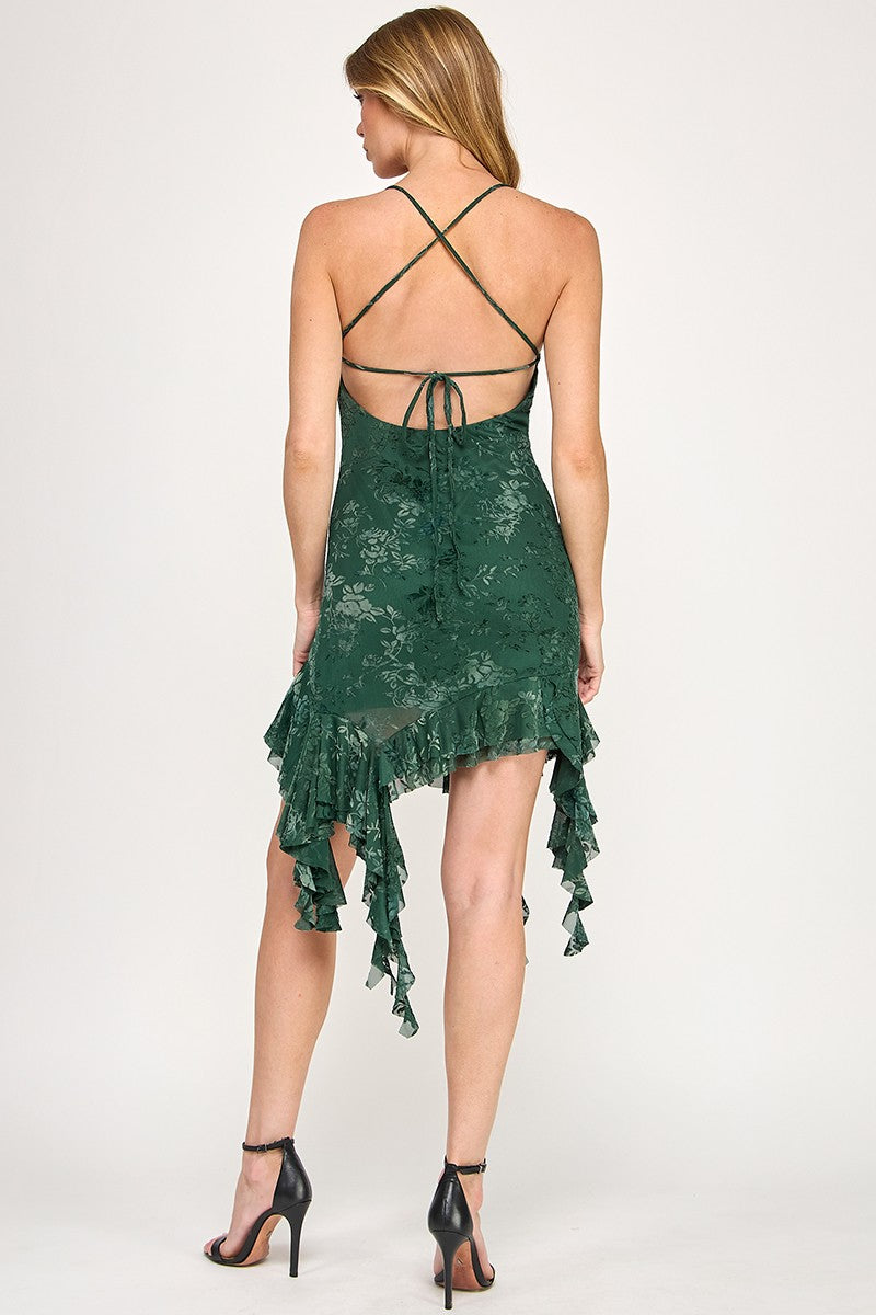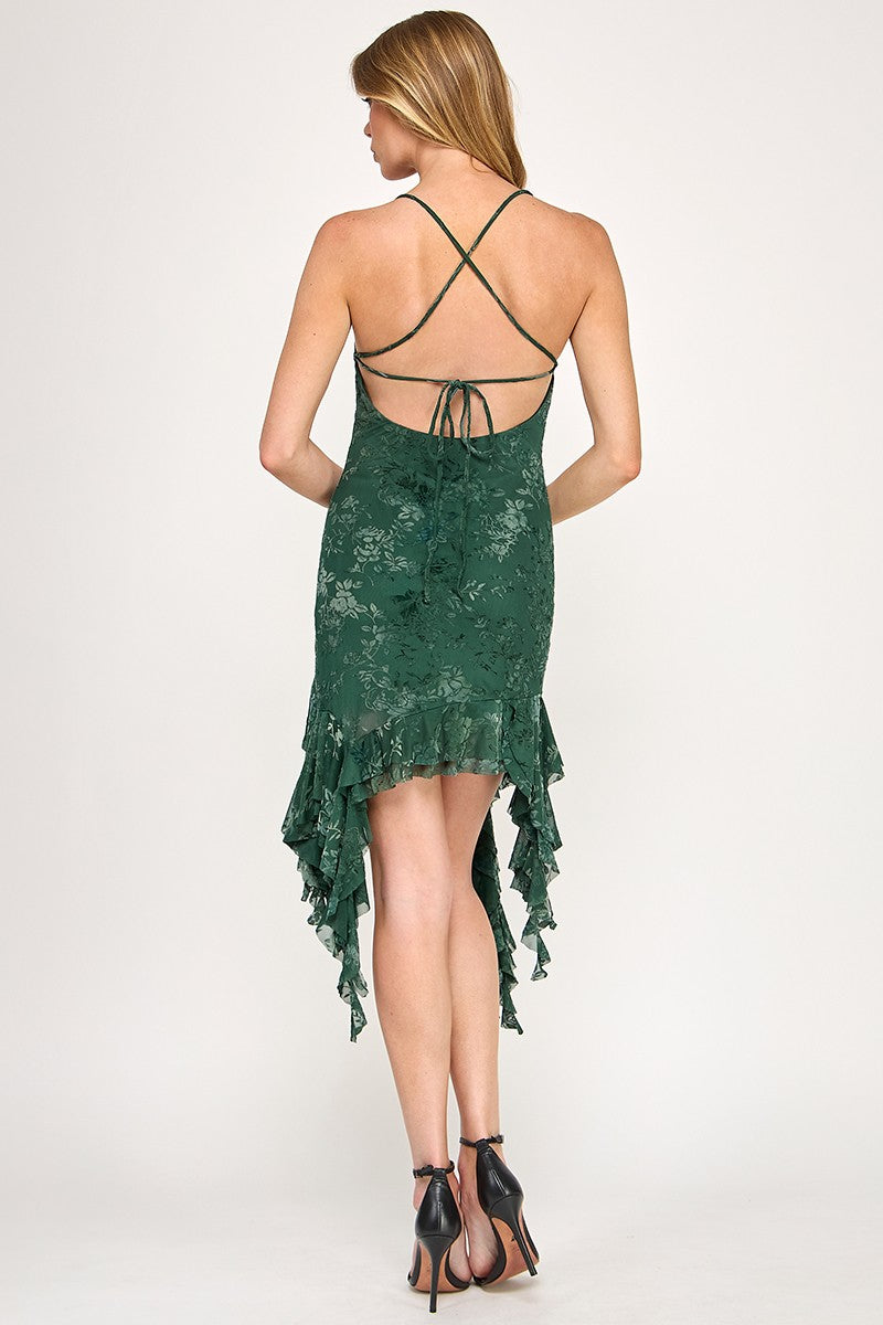 -Asymmetrical mini dress with a handkerchief hem. -Thin, spaghetti straps that wrap around and tie at the back -High-low handkerchief hem -Cowl neckline, draping softly across the chest -Floral burnout pattern -Fully Linen