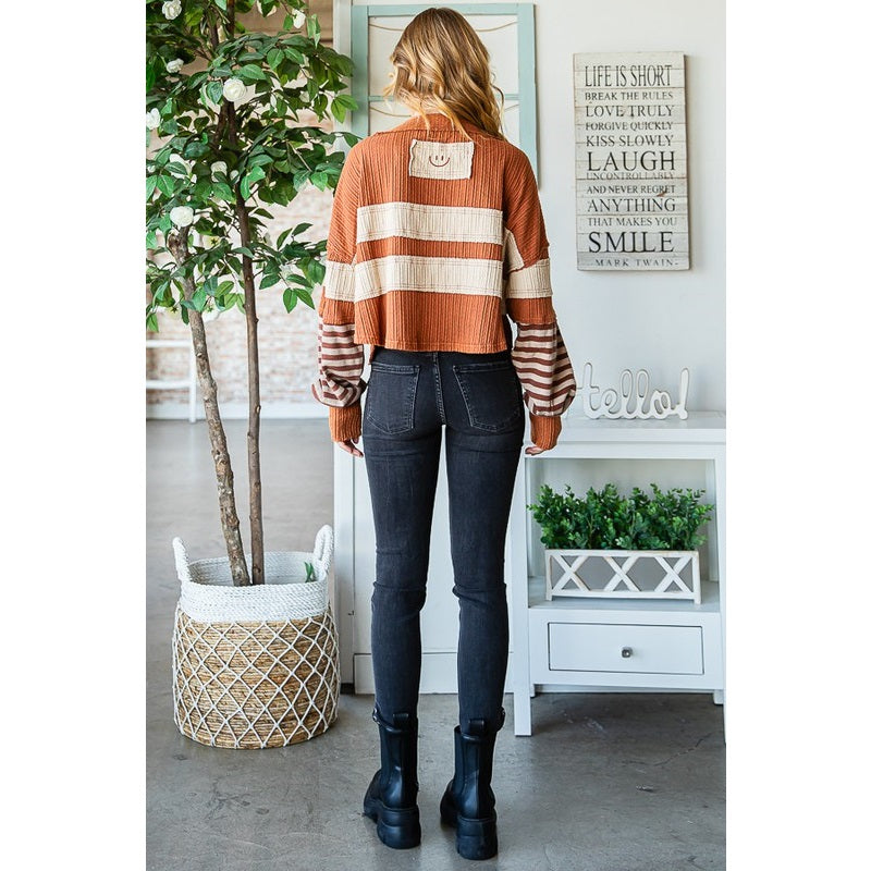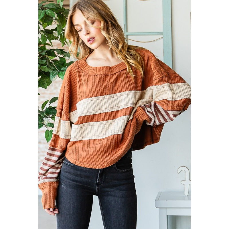 This long sleeve pullover brings a fun twist with its mix media striped detail and soft mineral wash finish. Designed for a relaxed fit that's true to size, it’s perfect for cozy days with a bit of style flair. Crafted from a comfy blend of cotton, polyester, and a touch of spandex, it offers just the right stretch to move with you. Whether layered or worn solo, this playful pullover adds a splash of striped charm to your casual wardrobe.