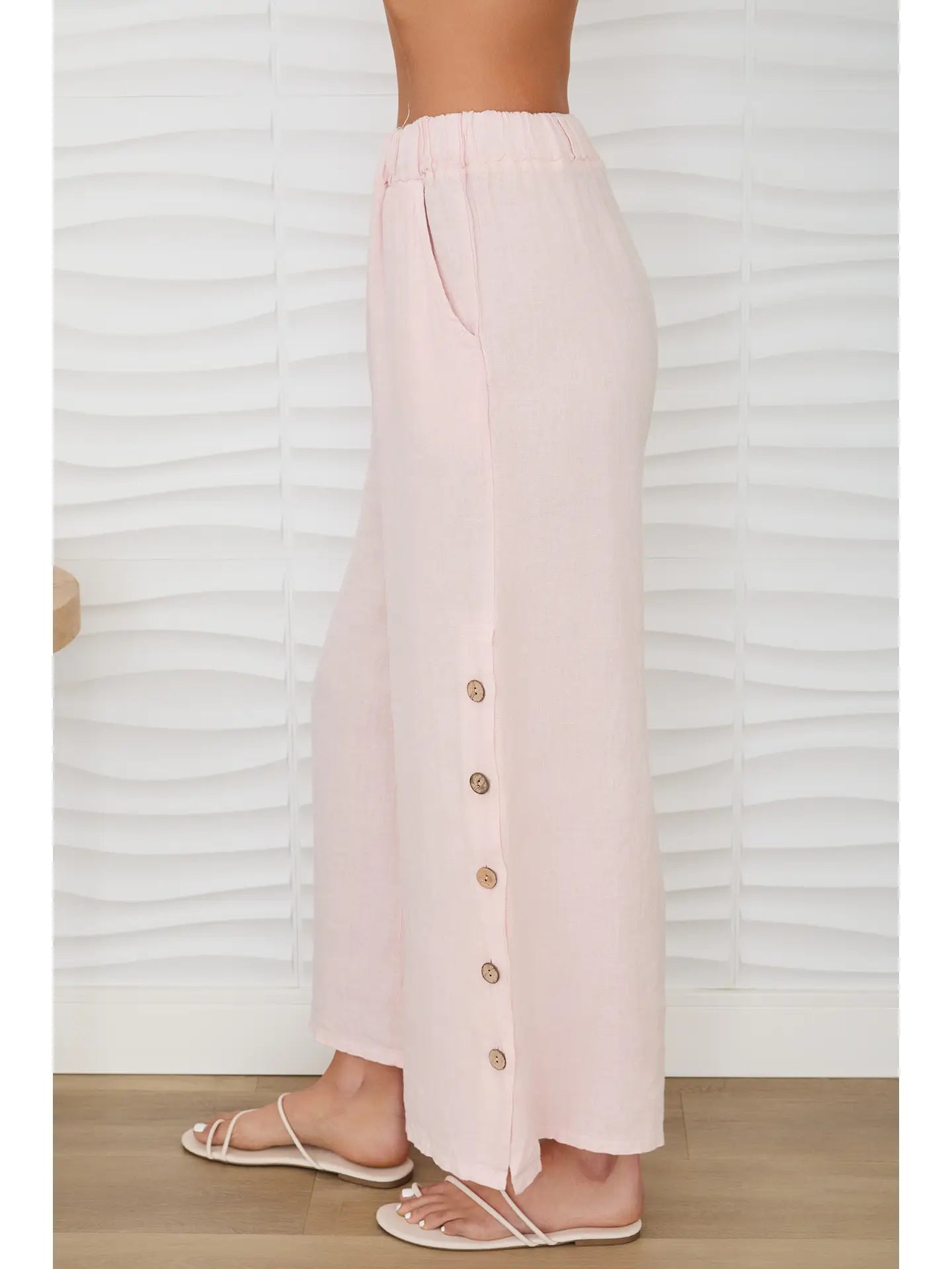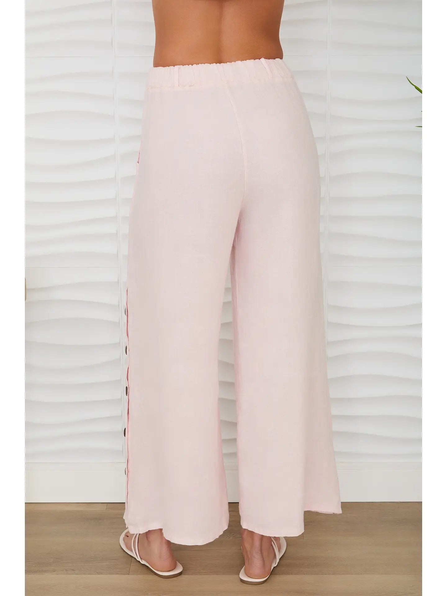 Step into effortless style with the Linen Drift Palazzo Pants. The wide-leg pants feature chic side button details and handy pockets, they blend comfort and flair perfectly. Whether at work or out on the town, these pants add a playful yet polished touch to any outfit.