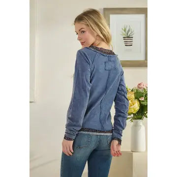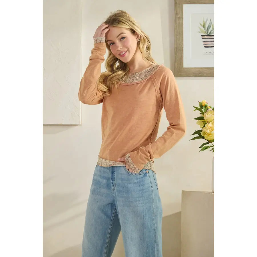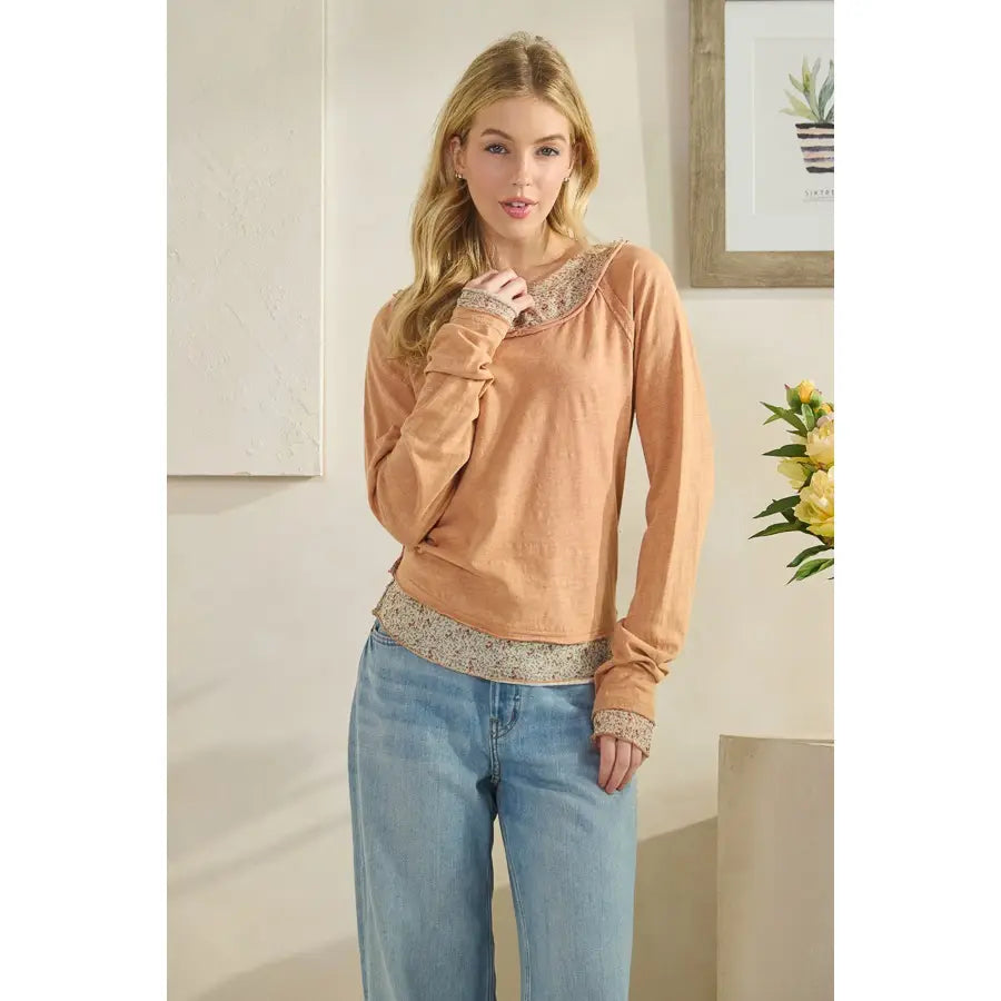 The Meadow Mist Top brings a fun twist to your wardrobe with its soft washed long sleeve design. Featuring a solid color base, playful floral mesh accents peek through at the top, bottom, and sleeve ends, adding just the right touch of whimsy. Perfect for layering or wearing on its own, this top effortlessly blends comfort with a hint of flirtatious charm.