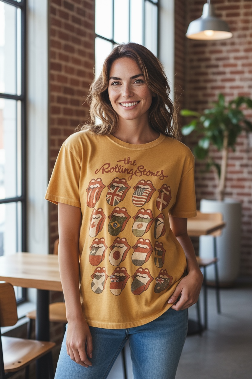 Celebrate rock 'n' roll vibes with this preloved Rolling Stones tee featuring the iconic lips logo in a vintage mustard hue. Softly worn for a lived-in feel, it’s perfect for adding a cool, playful edge to your wardrobe while keeping that timeless band spirit alive.