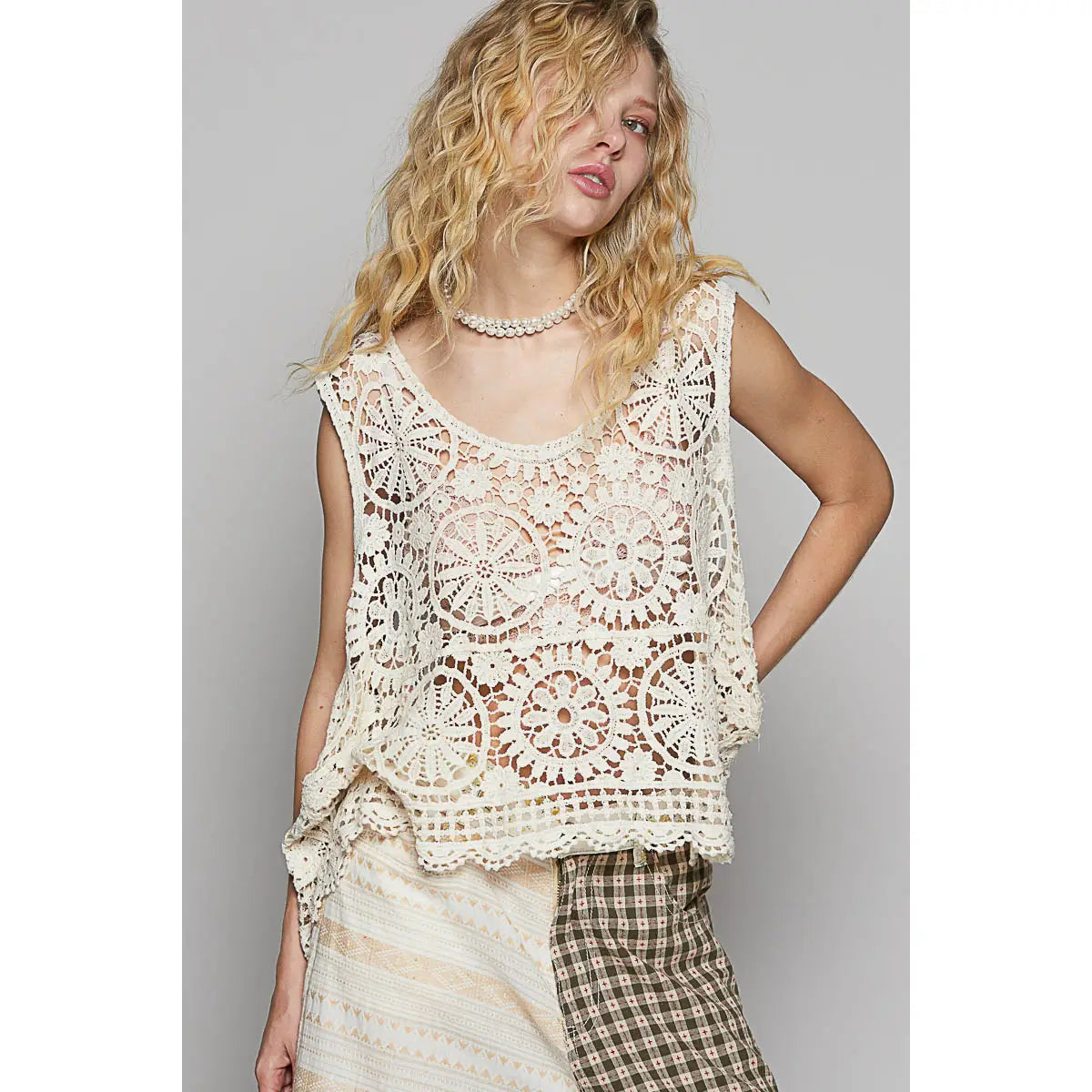 Embrace effortless summer vibes with the Sahara Breeze Crochet Top. This natural-colored, sleeveless piece features a charming round neck and intricate crochet detailing that keeps you cool and stylish. Perfect for sunny days and casual outings, it adds a touch of boho fun to any outfit with breathable comfort and playful texture.