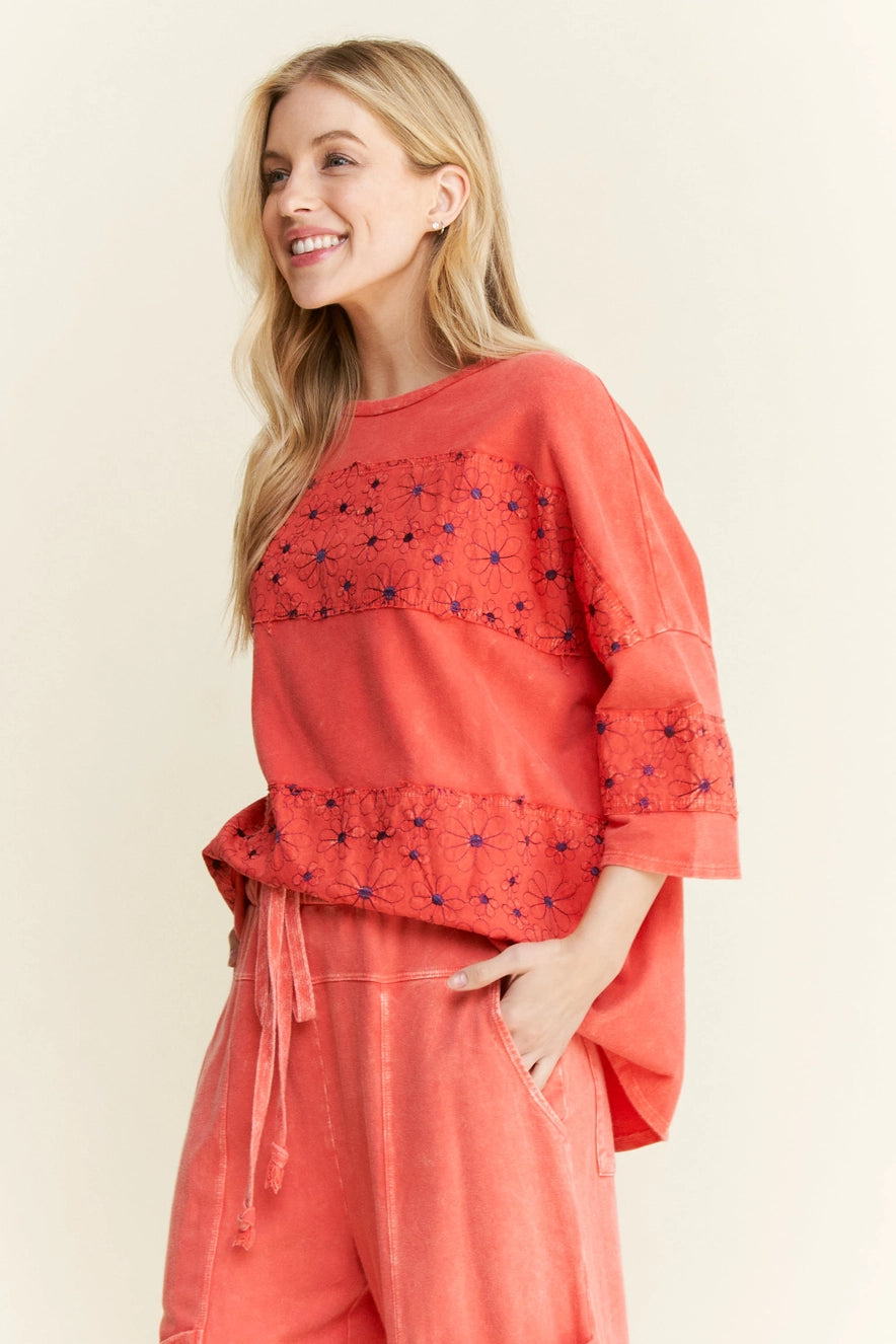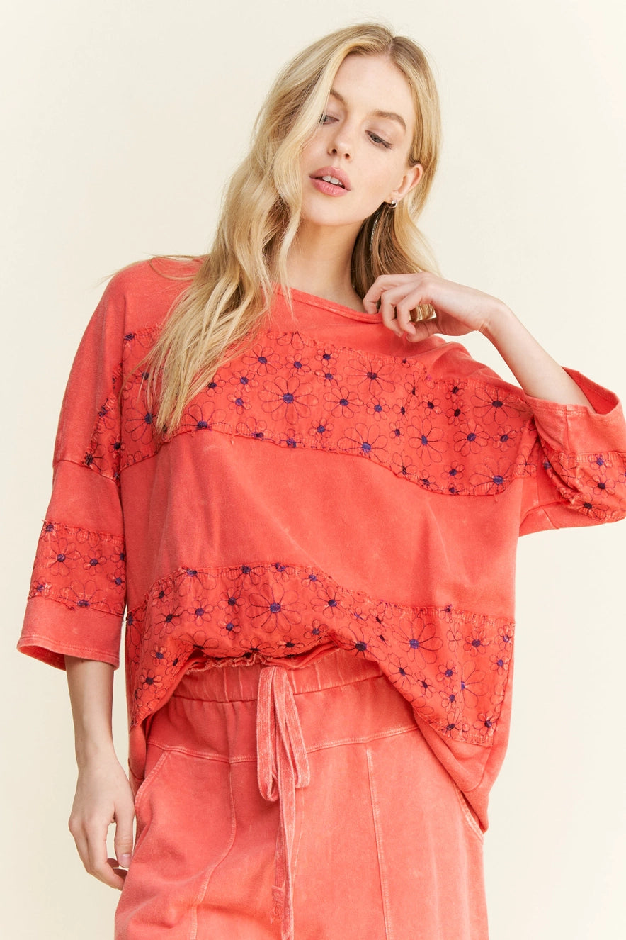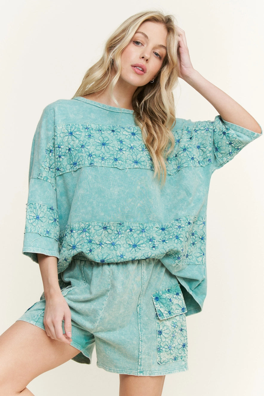 This Mineral-Washed, Flower-Embroidered Block T-shirt brings a fresh, fun vibe to your wardrobe. With its soft mineral wash finish and charming floral embroidery, it’s perfect for adding a splash of playful style to any casual outfit. Comfortable and eye-catching, it’s your go-to tee for effortless cool all day long.