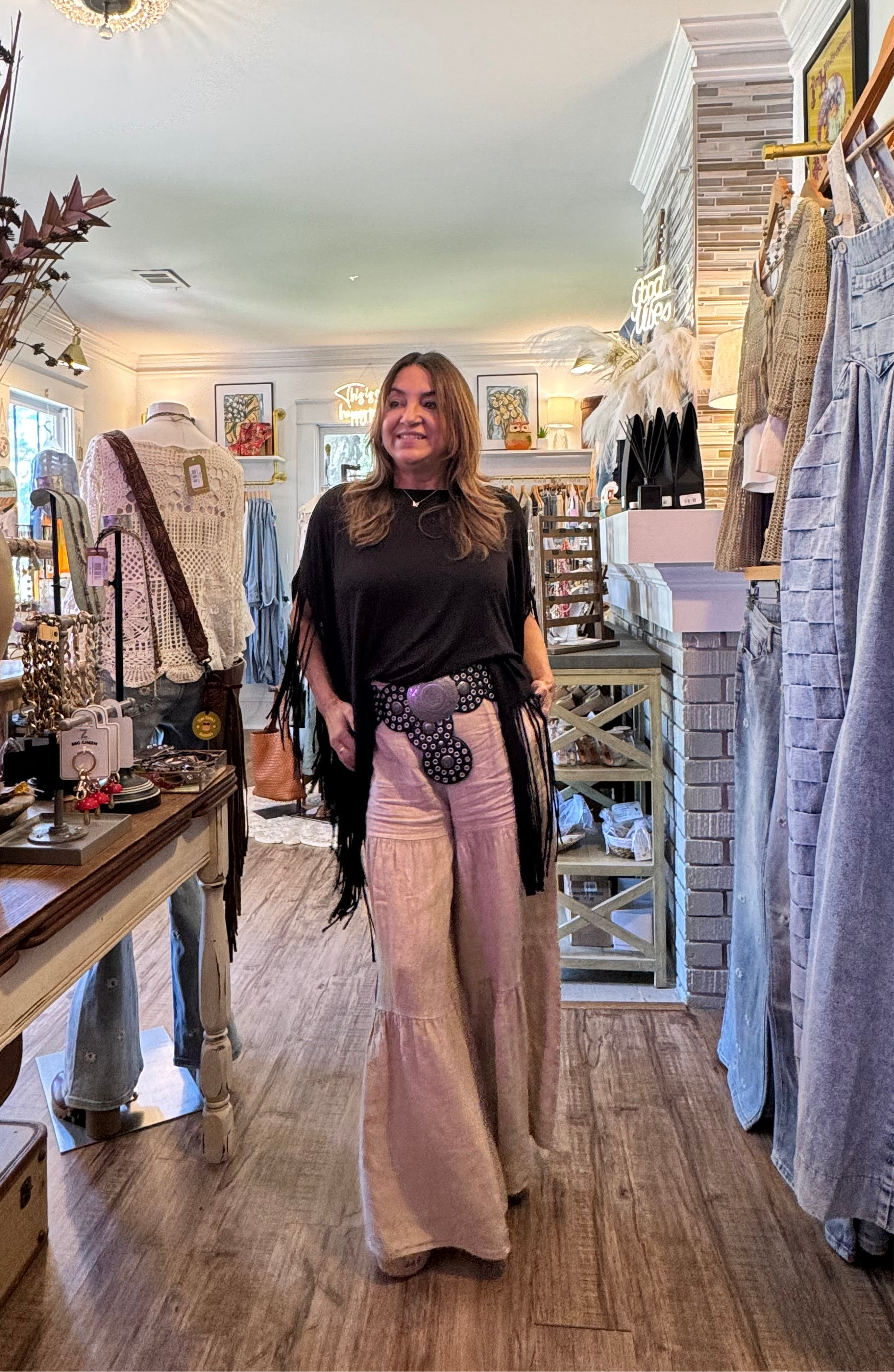 - * LARGE: Bust: 58", Hip: 58", Length: 28", Fringe length: 41", Fringe Sleeve length: 23"