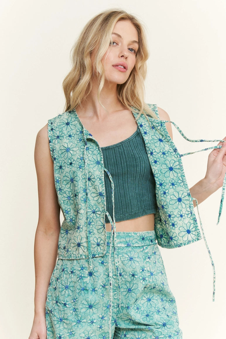 This mineral-washed woven vest features a charming embroidered flower pattern that adds a touch of whimsy to your outfit. The adjustable front bow ties let you customize your look with a playful flair, making it perfect for layering and expressing your unique style.